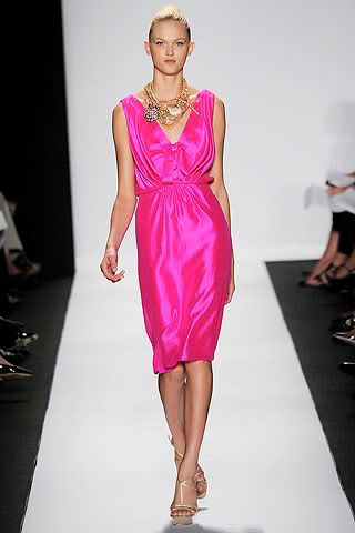 Last but not least, is my little tribute to the LPD...little pink dress. Pink dresses usually conjure up memories of nostalgia if you're a girl. Ballet tutu's (check the icon. ;) ), easter dresses, pink ribbons..anything that's girly from childhood. Pink is the ultimate girly color, and I actually don't oppose to men wearing it, either. As long as they make it work (Tim Gunn, I've been following you too long. LOL.). Thanks to the great 80's trend (which, I kinda wish would go away..just a tad), pink is a "color of the moment", borrowing a phrase from my buddy, Gabby. While pink isn't every girl's favorite color, DKNY's spring/summer line is out to change their minds about that.